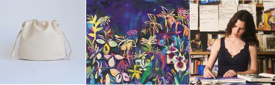 (左)オリジナルのソフトヴィーガンレザークラッチ (中)バッグの内側にあしらわれている作品 (右)バッグデザインを監修したフランス系カナダ人アーティスト、アリス・グルニエール=ヌブー