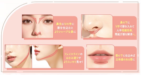 影を仕込んで骨格を強調。シャープで高い鼻やスッキリとしたフェイスラインを演出。