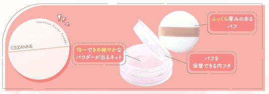 「セザンヌ シームレスカバーパウダー」は、肌悩みをしっかりカバーし柔らかな桃肌に仕上げるフェイスパウダー。球状のパウダーを配合し、メッシュネットを採用することで、パウダーを均一に取ることができ厚塗り感なく仕上げることができます。