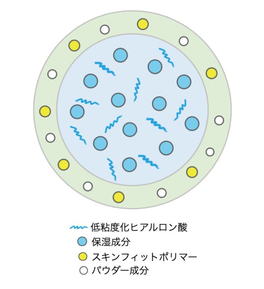 低粘度化ヒアルロン酸や保湿成分を閉じ込めた乳化カプセルを配合。ファンデーションを塗布することにより肌表面に保湿膜を形成し、肌の水分蒸散を軽減します。特殊製法により、保湿効果はそのままに肌への浸透性※42を高め、べたつきまで軽減したヒアルロン酸のこと。高い保湿力を誇りながらも、べたつかない処方を実現しました。