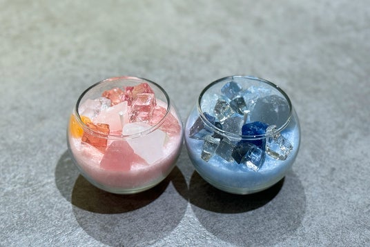 YOLUの香りを閉じ込めたキラキラパームワックスの上に、大小、質感さまざまな星型や鉱石型のキャンドルをお好きな組み合わせで飾り、オリジナルの夜空をイメージしたキャンドルに仕上げることができます。