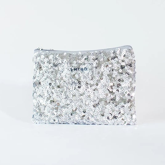 「2024 HOLIDAY MAKEUP」の製品を含む11,000円(税込)以上お買い上げのお客様へ、数量限定のノベルティをプレゼント。ホリデーシーズンの輝きと、“新しいわたし”に出会った瞬間のときめきをイメージしたポーチをご用意しました。光に呼応してきらめくシルバーのスパンコールと、さりげないSHIROのロゴが見るたびに気分を上げてくれます。エッセンスリップオイルカラーはもちろん、ジンジャーアイシャドウパレット(9色入り)も入るサイズです。