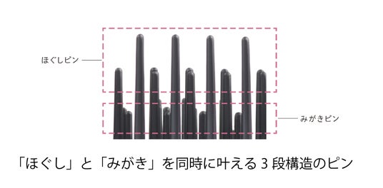 1.ほぐしピンとみがきピンによる3段構造で、瞬間、さらツヤを実現。ワンストロークでからまりをほぐし、髪のまとまりもツヤも同時に叶えるツヤメイクブラシ。