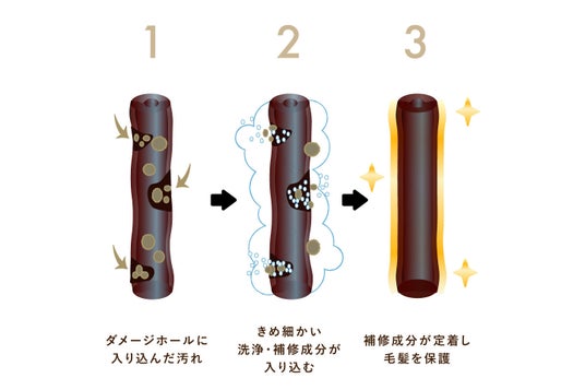 髪をただ洗って保湿するだけでなく、シャンプーと同時に補修をスタートさせ、トリートメントでは髪のダメージ要因までケアする仕組みを実現しました。