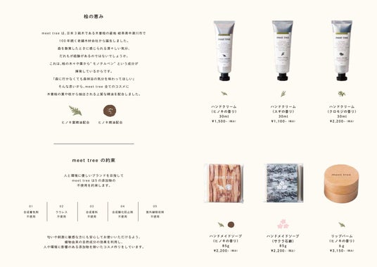 meet treeの商品は国産木材からとれた精油を使用しています。また5つの添加物不使用をお約束し、人と環境に影響のある添加物を除いたコスメづくりに真摯に向き合っています。私たちは自然そのものが持つ力が、美しさと健やかさをサポートしてくれると信じています。