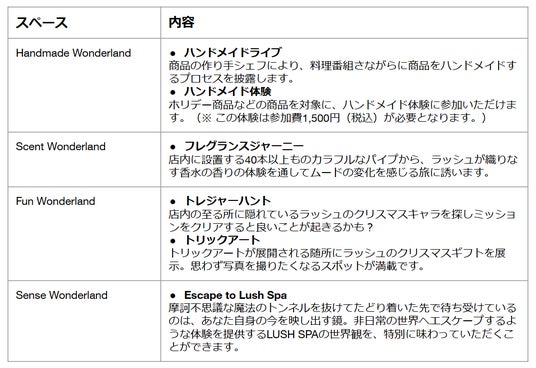 さらに、社会や環境を再生したり、社会における人や動物の権利を守る行動を起こし続けることで、化粧品業界から変革をもたらすべくコスメティックレボリューションを起こす力を持つ商品を開発し続け、化粧品のパッケージや広告ではなく、何よりも商品の中身にコストをかけ、お客様のベネフィットを最大限に考えた商品開発を継続しています。「LUSH MAGICAL WONDERLAND」は、人々の感覚を研ぎ澄ますショップ体験とともに、これらすべてのラッシュが提案する商品を存分にショーケースするスペースであり、来店するすべての方をハッピーな気分にするクリスマスの魔法をかけたラッシュのワンダーランドを体現したイベントです。