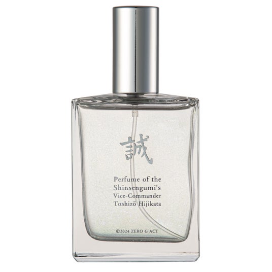 土方歳三が所属していた新撰組をイメージした「誠」の刻印とキャップが、透明なガラスボトルの上で刀のような銀色に輝きます。香水の中には意外とロマンチストな一面をイメージしたセクシーな青紫のラメが上品な美しさを醸し出し華麗に舞い踊ります。
