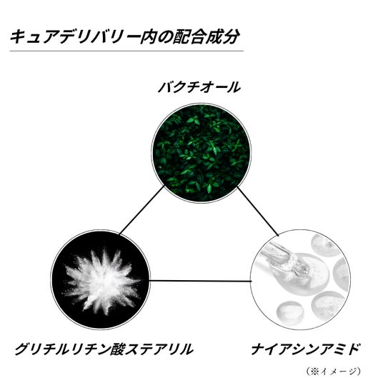 近年、次世代レチノールとも呼ばれる「バクチオール」※5はレチノールと非常に似たエイジング作用※6を示しながらも、レチノールの弱点である「肌質を選ぶ」「光への安定性」の影響を受けにくい優れた成分です。このバクチオールがキュアデリバリーシステムにより角層の隅々まで素早くしっかりと届けることができます。