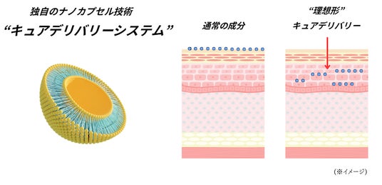 「リン脂質」を用いた微細な独自カプセル技術(キュアデリバリーシステム)により内包した美容成分が角層深くで放出され、肌の隅々まで効率的にスキンケア効果を発揮します。