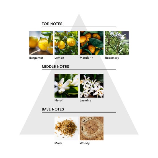 トップは、明るく元気なシトラスにローズマリーのアロマティックな香りが融合し、新鮮で心地よい朝の感覚を思い起こさせます。ミドルは、ネロリやジャスミンの軽やかで洗練されたフローラルの香りが五感を満たし、心地よい優雅な気分へ。ベースのムスクやウッディが、香り全体に温かみと安心感を添え、まるで新しい章を開くような、清々しさと提供します。