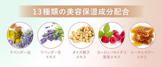 ラベンダー油やラベンダー花エキス、ダイズ種子エキス、ヨーロッパキイチゴ果実エキス、ローヤルゼリーエキスなどをはじめとした13種類の美容保湿成分を配合。