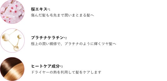 *1 ソメイヨシノ葉エキス/サトザクラ花エキス(全て保湿成分) *2 加水分解ケラチン(羊毛・羽毛)/ケラチン(羊毛)(補修成分) *3 γ-ドコサラクトン(補修成分) *4 アルガニアスピノサ核油(保湿成分) *5 スクレロカリアビレア種子油(保湿成分)