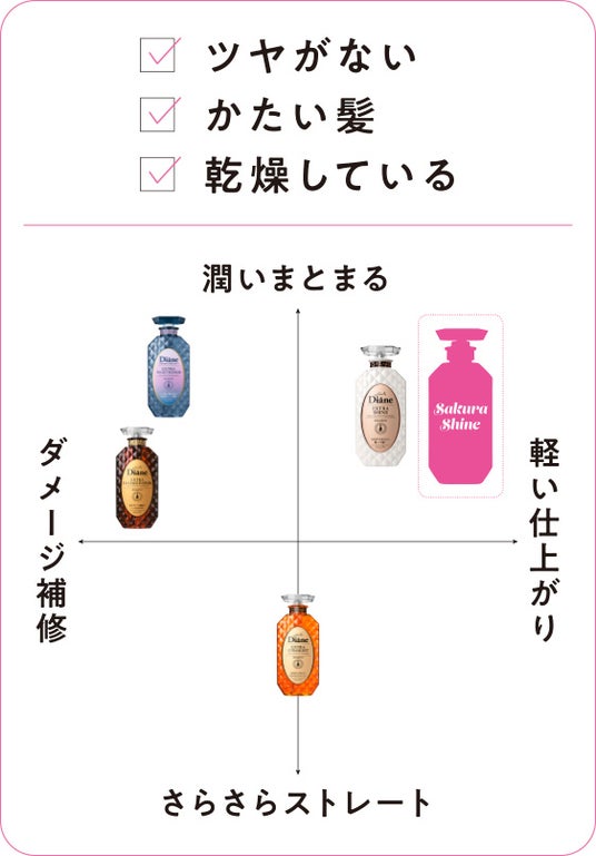 『ダイアン サクラ シャイン』で、ひと足早く香りを春仕様に変えて、ツヤのある輝く髪で春のお出かけの準備をしてみませんか。