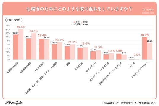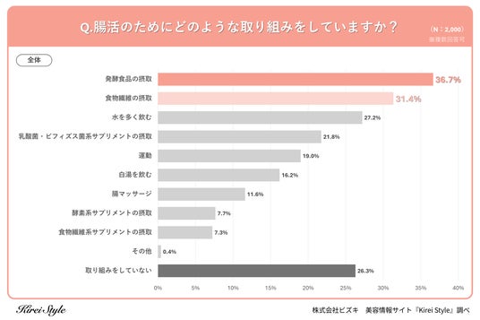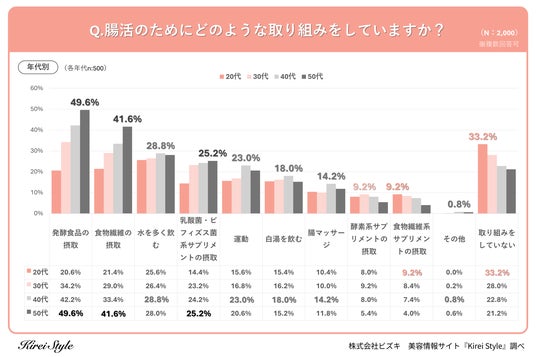 「今のキレイも、10年後の輝きも」をコンセプトに美容や健康にまつわる情報を発信する「Kirei Style(キレイスタイル)」の運用を行う株式会社ビズキは、全国の女性2,000人を対象に腸活に関するアンケートを実施し、年代別等の特徴についてまとめました。
