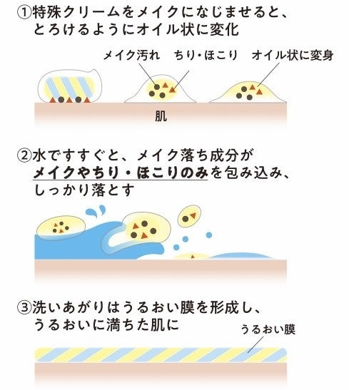 当社は、クリームを汚れとなじませるとオイル状に変化し、水で洗い流したときにヌルつき感の少ない、肌の構造とよく似たラメラ構造の潤い膜を形成するオリジナルの技術を採用することで、洗い流した後も肌の潤いが逃げることのないクレンジングクリームを開発しました。