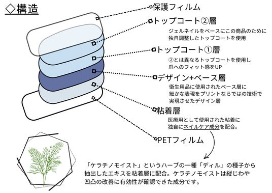 UV/LEDライトで硬化する仕様のため、トップコート2.は市販ジェルネイルを製造している企業にてトップコートジェルをベースに ステッカーとして半硬化にできるよう、この商品のために独自に調整を行いました。