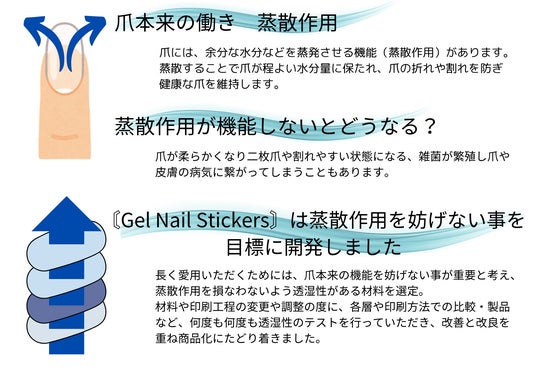 Gel Nail Stickersは貼ることによって爪の乾燥しすぎを抑えつつ、爪自体が本来持っている蒸散を妨げないよう透湿性がある材料選定と工程で、 貼っているのに自然な爪に近い、を目標に商品開発を行いました。