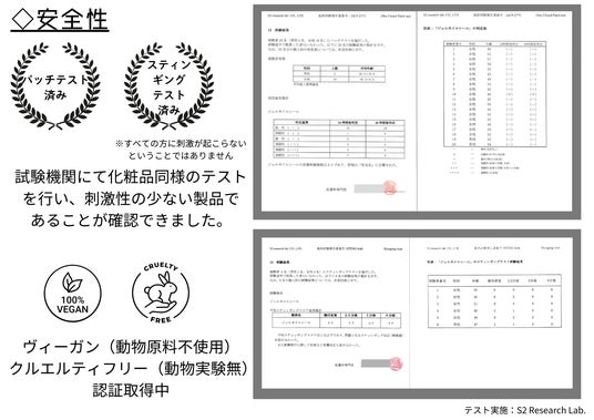 スティンギングテストとはかゆみやヒリヒリ感を評価する感応性テストで、敏感肌化粧品の評価に使用されます。 パッチテストでは安全品との評価、スティンギングテストにおいては低刺激との評価を受けました。