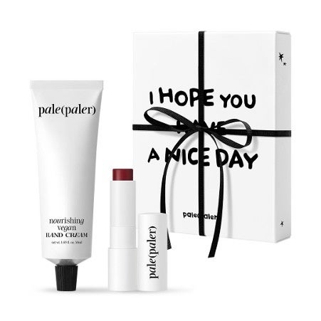 韓国デパートでもおなじみのヴィーガンブランドpale(paler)の今年のホリデーセットは、贈り物に最適なリボン付きギフトボックスに、HAPPY HOLIDAYのミニメッセージカードつき。なめらかな塗り心地のルビーカラーのリップと、潤いヴェールで乾燥からお肌を守るハンドクリームが、ホリデーパッケージになって登場。