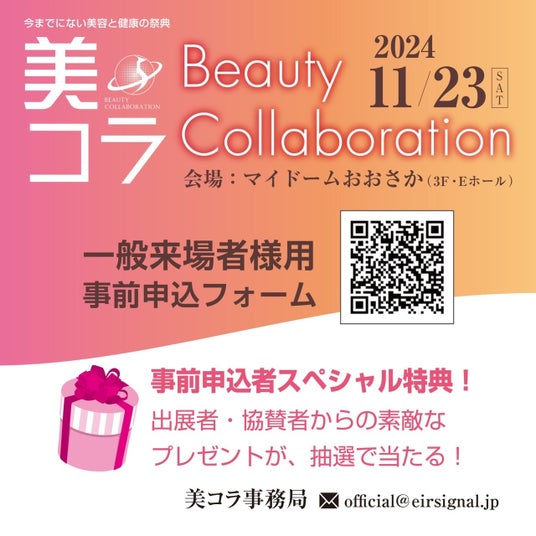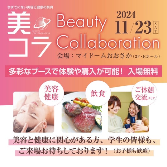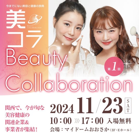 美コラ運営事務局(大阪市中央区久太郎町1-6-21 シャンクレール本町4階)では、11月23日(土)10時~17時、マイドームおおさか(3F・Eホール)にて、今までにない美容と健康の祭典Beauty Collaboration(ビューティーコラボレーション)、略称「美コラ」第1回を開催いたします。