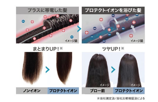 プロテクトイオン搭載で、髪のツヤや髪のまとまりを向上します(※3)。マイナスイオンとプラスイオンを同時に放出することで、それぞれのイオンが髪に働き、髪の広がりや傷みの一因となる静電気を抑制します。