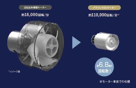BLDCモーターを搭載した当製品は、当社従来品より約6.8倍(※2)のモーター回転数を実現しました。毎分約11万回の高速回転が可能なBLDCモーターは風速・風圧のあるパワフルな風を送り、髪をすばやく乾かします。