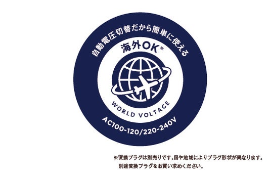 海外でも変圧器不要で使えるマルチボルテージ(自動電圧切替式)を採用。手動での切り替え忘れが原因の火災ややけど・故障の心配がありません。AC100-120/220-240Vに対応しています。