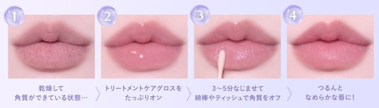 乾燥やティントリップで皮むけした唇に、トリートメントケアグロスをたっぷり重ねて綿棒でくるくるするだけ!