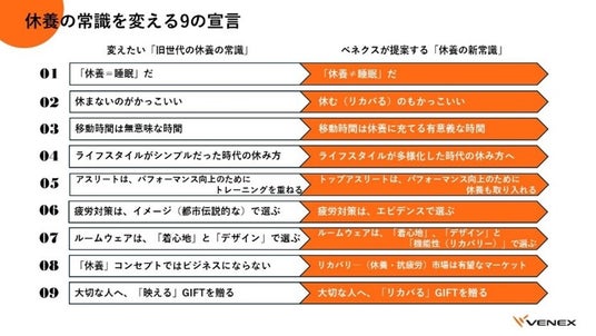 「休む(リカバリーする)こと」を意味する造語「リカバる」をキーワードに、「休むこと」に対して罪悪感を抱きがちだったこれまでの考え方、“旧世代の休養の常識”を、ベネクスが考える“休養の新常識”として刷新する「休養の常識を変える9の宣言」を発表。ひとりひとりのライフスタイルに合った様々な「休養」ソリューションを伝える活動をしています。