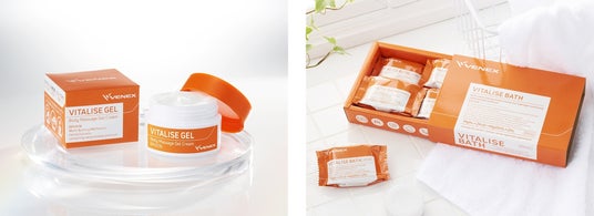 休養時専用「リカバリーウェア」を提供してきたベネクスが新たに提案するのは、生命や活力を意味する「VITAL」と、増やす・高めることを意味する「RISE」を合わせ、休養を通して毎日を元気に過ごすための活力向上に繋げてほしいと願いを込めて開発した、新商品『VITALISE』シリーズ。お風呂上がりやマッサージの時に肌に塗布して使用する『VITALISE GEL』、体の冷えが気になったり、疲れを感じる時におすすめの入浴剤『VITALISE BATH』の2種類です。