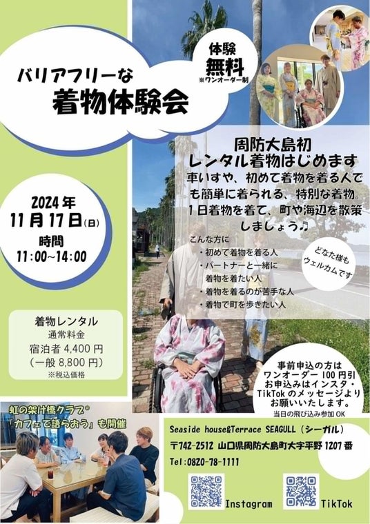 Seaside house & Terrace SEAGULL(シーガル)で、周防大島初となるレンタル着物サービスを開始します。そこで、より多くの方が気軽に日本の伝統的な文化に触れられるよう、車いす利用者や着物初心者の方でも簡単に着られる特別な着物をご用意しました。伝統の美しさを大切にしながらも、現代の多様なニーズに応えるデザインと機能性を兼ね備えており、誰もが楽しめる「バリアフリー」な着物体験をめざしています。SDGsの目標である「誰一人取り残さない」という理念に賛同し、環境にやさしい素材とサステナブルな運営を心がけています。地域の皆様との協力のもと、着物の魅力を楽しみながら、持続可能な観光体験を提供いたします。周防大島の美しい海辺や町並みを背景に、日本の伝統が融合する特別な一日をお楽しみください。