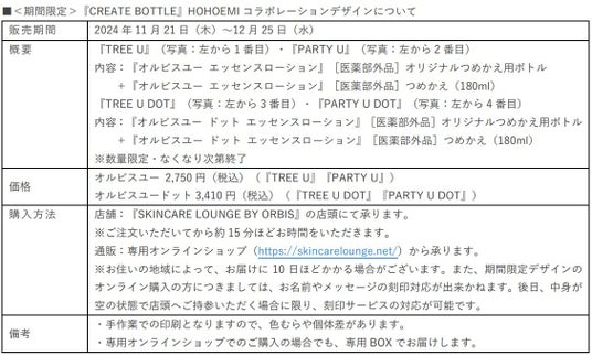 本イベント期間中、人気サービス『CREATE BOTTLE』に期間限定デザインが登場します。描き下ろしデザイン 2 種を纏った『オルビスユー エッセンスローション』のつめかえ用ボトルに加えて、『オルビスユー ドット エッセンスローション』のつめかえ用ボトルの全 4 種を販売いたします。