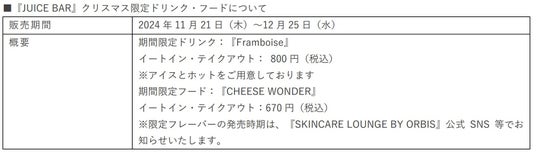 1 階『JUICE BAR』では、クリスマス限定ドリンク・フードを販売いたします。フランボワーズをメインにアーモンドミルクと合わせたドリンク『Framboise(フランボワーズ)』と、一度は食べてみたいお取り寄せスイーツ として話題の発明的チーズケーキ『CHEESE WONDER(チーズワンダー)』をお楽しみいただけます。