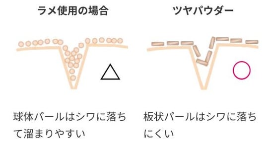 POINT3:塗ってもシワが目立ちにくいシワに入り込んで悪目立ちさせてしまうラメは不使用。シワに落ちにくい板状のパールを多く配合し、正面から光を反射させ、ツヤ感を演出します。