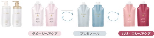 シャンプー・トリートメントの専用空ボトルをラサーナ全シリーズ共通化し、詰め替え用パウチのサイズも共通化したため、従来の詰め替え方法では難しかったシリーズ間の切り替えが容易になり、髪や頭皮のお悩みに合わせて、シリーズ変更がしやすくなりました。