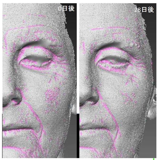 左画像のように、クロレラエキス0.2%配合クリームを28日間使用したところ、 肌のハリ・弾力の改善が見られたので、「NIYODOブルー リンクルエッセンス」には同様のクロレラエキスを有効量配合。