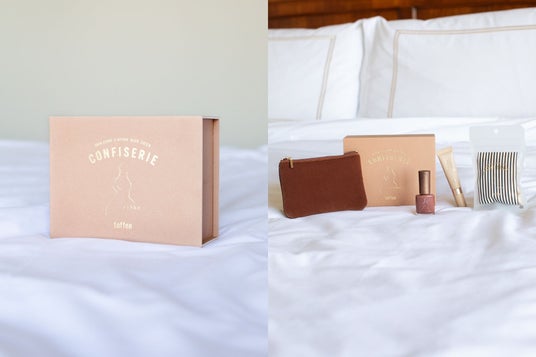 濃厚なカフェオレ味のトフィーをイメージしたリップグロス、ネイルポリッシュ、やわらかな手触りと高級感のある素材のベロア生地を使用した、持ち歩きにぴったりなサイズのペティートポーチ、カフェオレ味のキャンディをコスメ収納ボックスに詰め合わせた、ホリデー限定のcandy boxコフレ。リップグロスとネイルポリッシュはいずれも現品サイズです。
