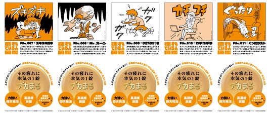 特大サイズの『温泡 デカまる』(1錠)とともに、人気漫画『サ道』のマンガ家・タナカカツキさんがデザインした“お疲れあるある“のイラストを同封します。(イラストは全5種類の中から1種を同封)