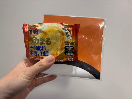 発泡入浴剤『温泡 デカまる』を手に取っていただくことにより、「疲れがとれる広告」をコンセプトに設定。袋を取って、「疲れ」の文字がとれると、人気漫画『サ道』のマンガ家・タナカカツキさんがデザインした「スッキリとした姿のキャラクター」が登場します。袋には特大サイズの『温泡 デカまる』(1錠)とともに、タナカカツキさんがデザインした“お疲れあるある“のイラストを同封します。