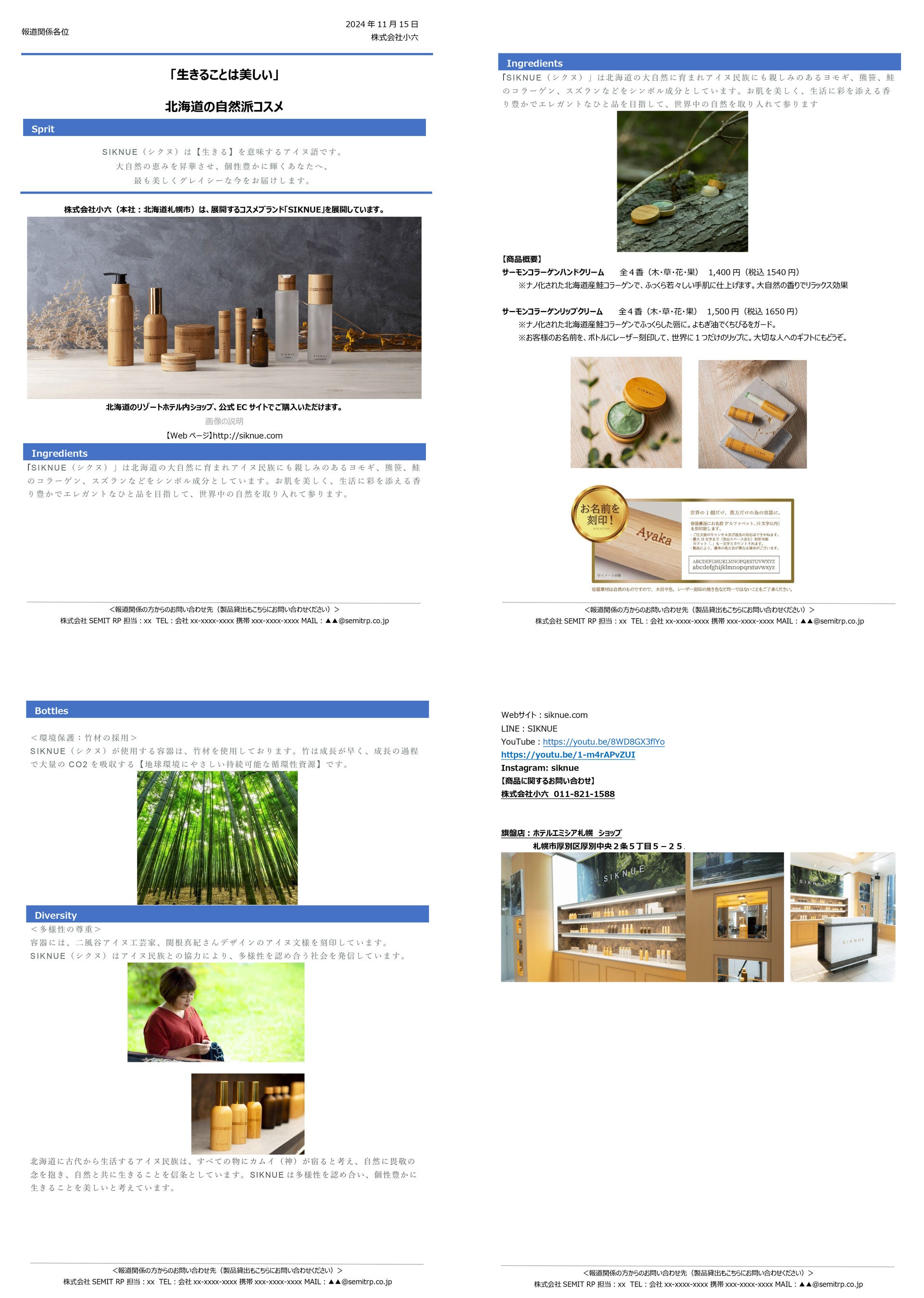 SIKNUE(シクヌ)とは【生きる】を意味するアイヌ語です。大自然の恵みを昇華させ、個性豊かに輝くあなたへ、最も美しくグレイシーな今をお届けします。