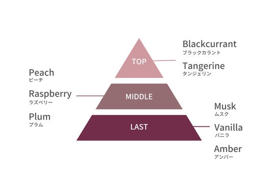 フレグランスについてマンダリンオレンジ、ラズベリーやプラムなどフルーティーさが香り立ち、ラストノートはバニラ、アンバー、ムスクなどやさしい甘さが重なります。