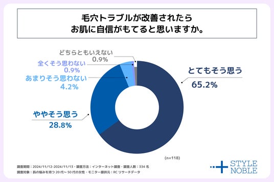 調査の最後、毛穴ケアを行っていると回答された方に「毛穴トラブルが改善されたらお肌に自信がもてると思うか」を問う設問への回答で最も多かったのは「とてもそう思う」で65.2%、次いで「ややそう思う」が28.8%で続く結果となりました。この結果から、9割以上の方が毛穴トラブルが改善されれば、肌に自信が持てると考えていることが明らかにになりました。