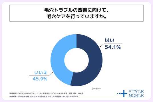 また、毛穴トラブルに悩んでいると回答された方に「毛穴トラブルの改善に向けて、毛穴ケアを行っているか」を尋ねる設問への回答では、「はい」が54.1%、「いいえ」が45.9%という結果となりました。この結果から、毛穴トラブルに悩んでいる方の半数以上は毛穴ケアを行っていることが明らかになりました。