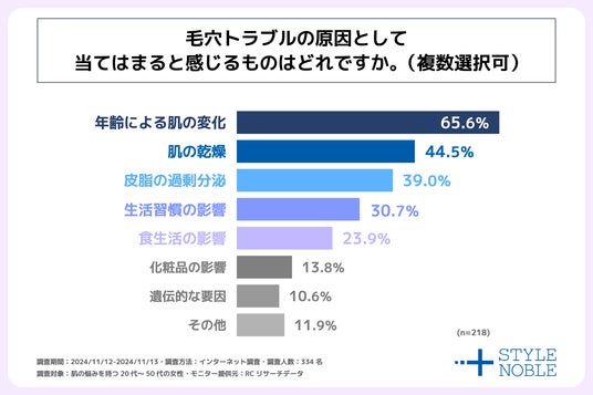 次に、毛穴トラブルに悩んでいると回答された方に「毛穴トラブルの原因として当てはまると感じるものはどれか」を問う設問の回答で、最も多かったのは「年齢による肌の変化」で65.6%でした。次に「肌の乾燥」が44.5%、「皮脂の過剰分泌」が39.0%で続く結果となりました。この結果から、毛穴トラブルの原因としては、年齢による肌の変化が最も大きいと感じられていることが判明しました。