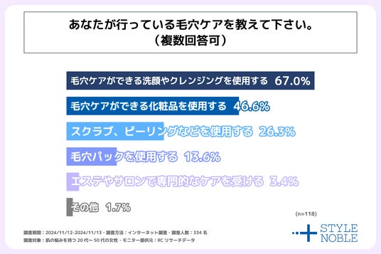 次に、毛穴ケアを行っていると回答された方に「行っている毛穴ケアを教えて下さい」と尋ねる設問への回答では1位が「毛穴ケアができる洗顔やクレンジングを使用する」で67.0%、2位が「毛穴ケアができる化粧品を使用する」で46.6%、3位が「スクラブ、ピーリングなどを使用する」が26.3%で続く結果になりました。この結果から、毛穴ケアでは、毛穴ケアができる洗顔やクレンジングを使用している方が多いことがわかりました。