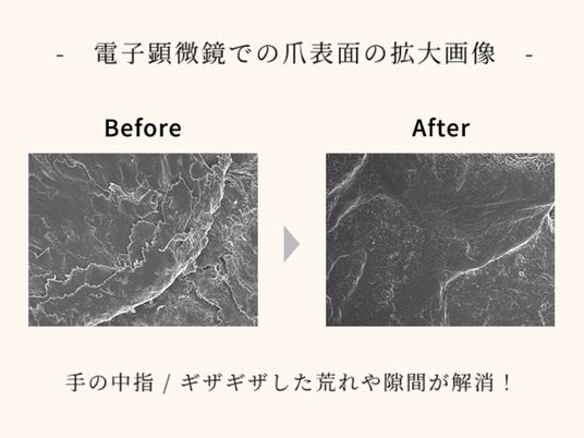爪の主成分であるケラチンの生成を助けるヘマチンを高濃度で配合。高濃度ヘマチンが爪のケラチンにピタっと密着し、ボロボロの爪をなめらかにします。