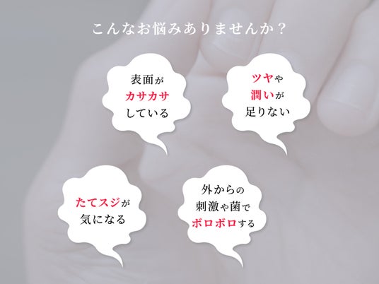 爪の主成分であるケラチンは自己修復機能がほとんどなく、爪が傷んでしまうと多くの方がジェルネイルで見た目をカバーしたり、自然に生え変わるのを待つことが一般的です。そこで、ネイルケア専門ブランドTITANAIL(チタネイル)監修のもと、サロンに通わずとも簡単に美しい爪に近づけることを目指し、傷んだ爪の表面を瞬時に補修するネイルケア製品として開発いたしました。