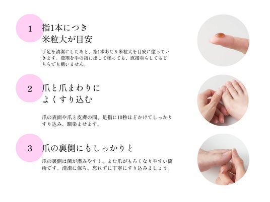 適量を爪表面や甘皮、爪先端の裏側に直接塗布し、指で馴染ませてください。一度に何度も繰り返し塗布すると、まれに爪が着色することがあります。