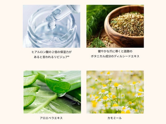 爪の内部が乾燥すると、爪が硬く変形しやすくなってしまうため、保湿が大切です。そこで、ヒアルロン酸の2倍の保湿力があると言われるリピジュア(R)、健やかな爪に導くと話題のボタニカル成分のディルシードエキス、アロエベラエキス、カモミールなどの美容成分が潤いある爪に導きます。