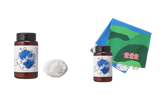 (左)TTTMSW×Pororoca Figura Bliss Bath Salts フィグラ ブリス バスソルト ¥4,950(税込)(右)TTTMSW×Pororoca Bath Salts & Bandana Set バスソルト&バンダナセット ¥12,650(税込)